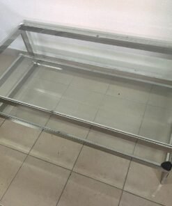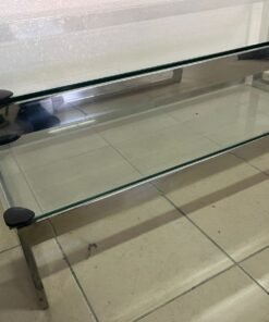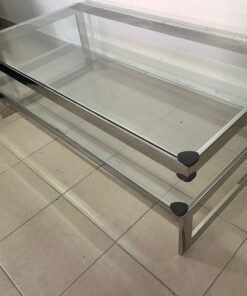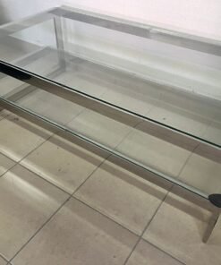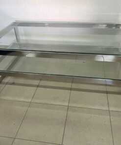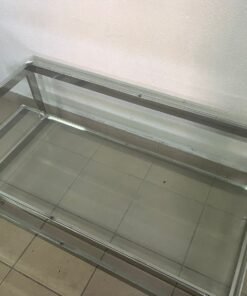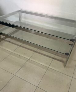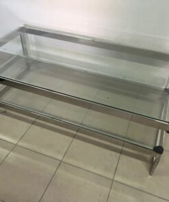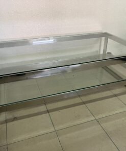 A chrome-plated coffee table with two thick glass shelves. French made.