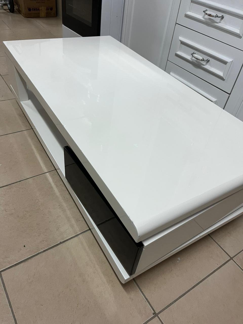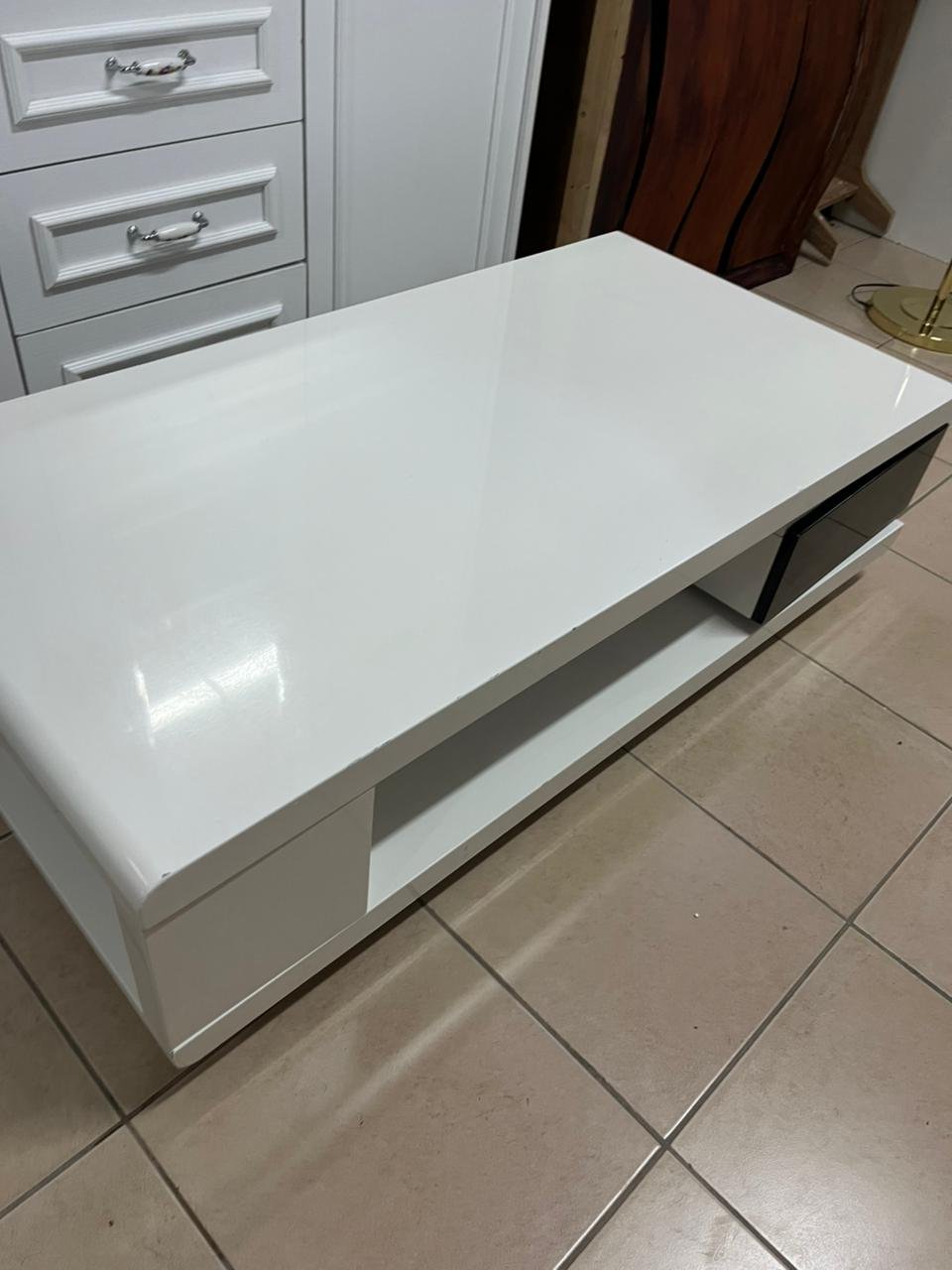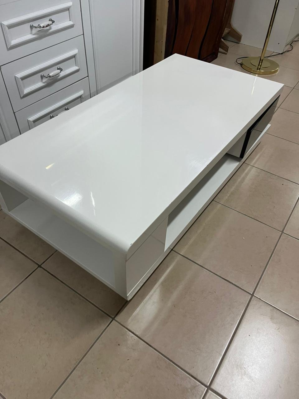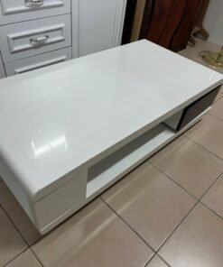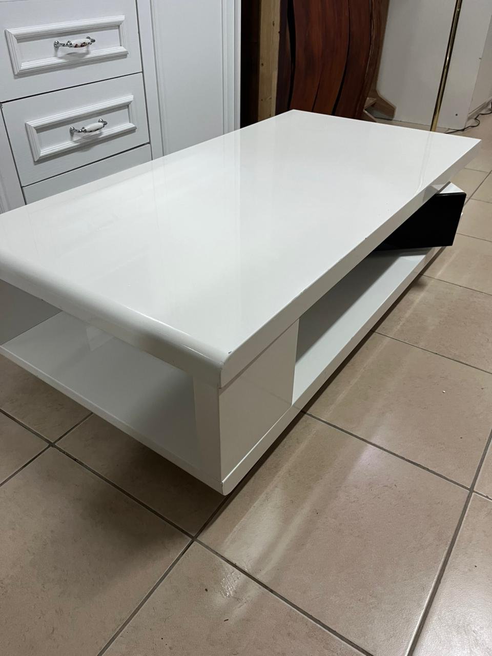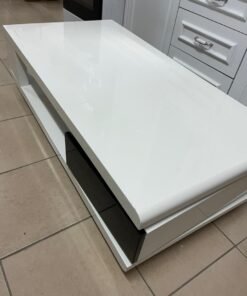 A modern coffee table in glossy white with a black lower drawer featuring a distinctive geometric design.
