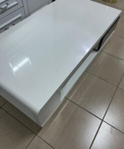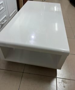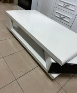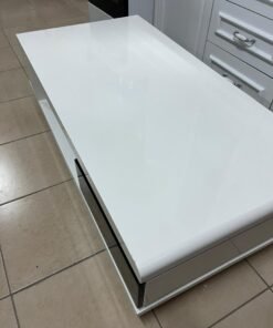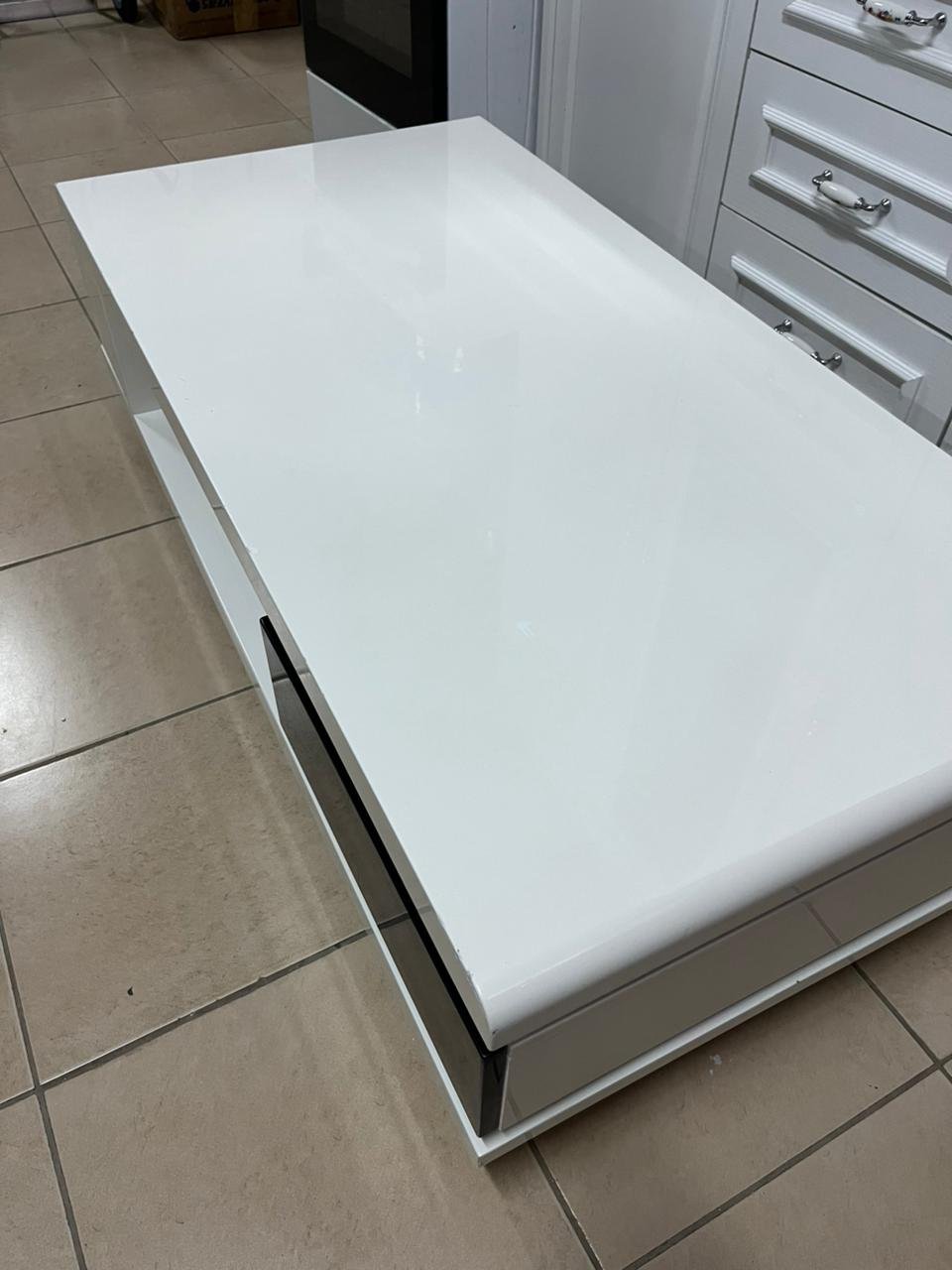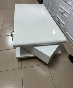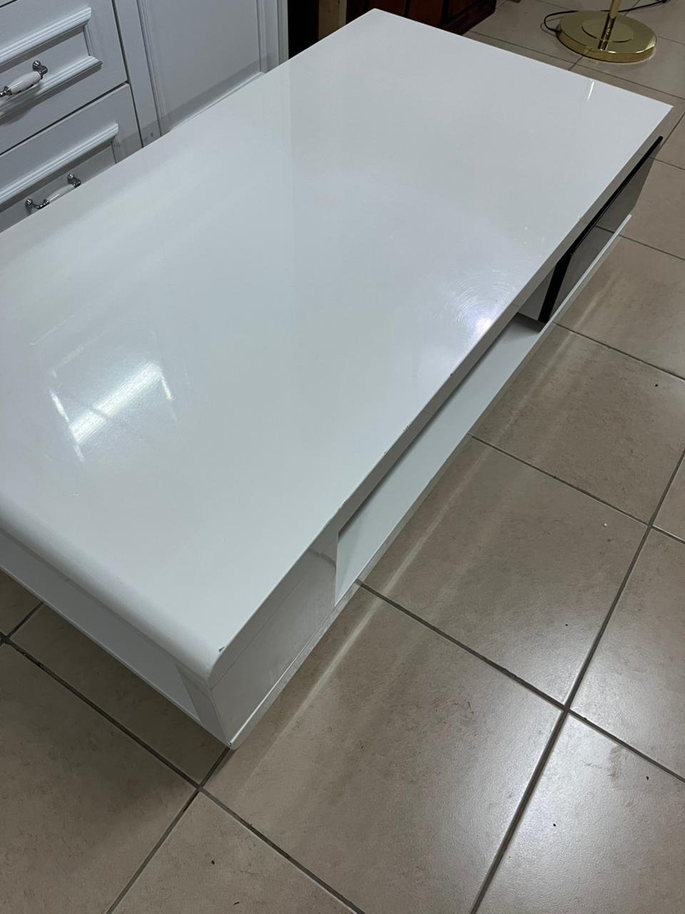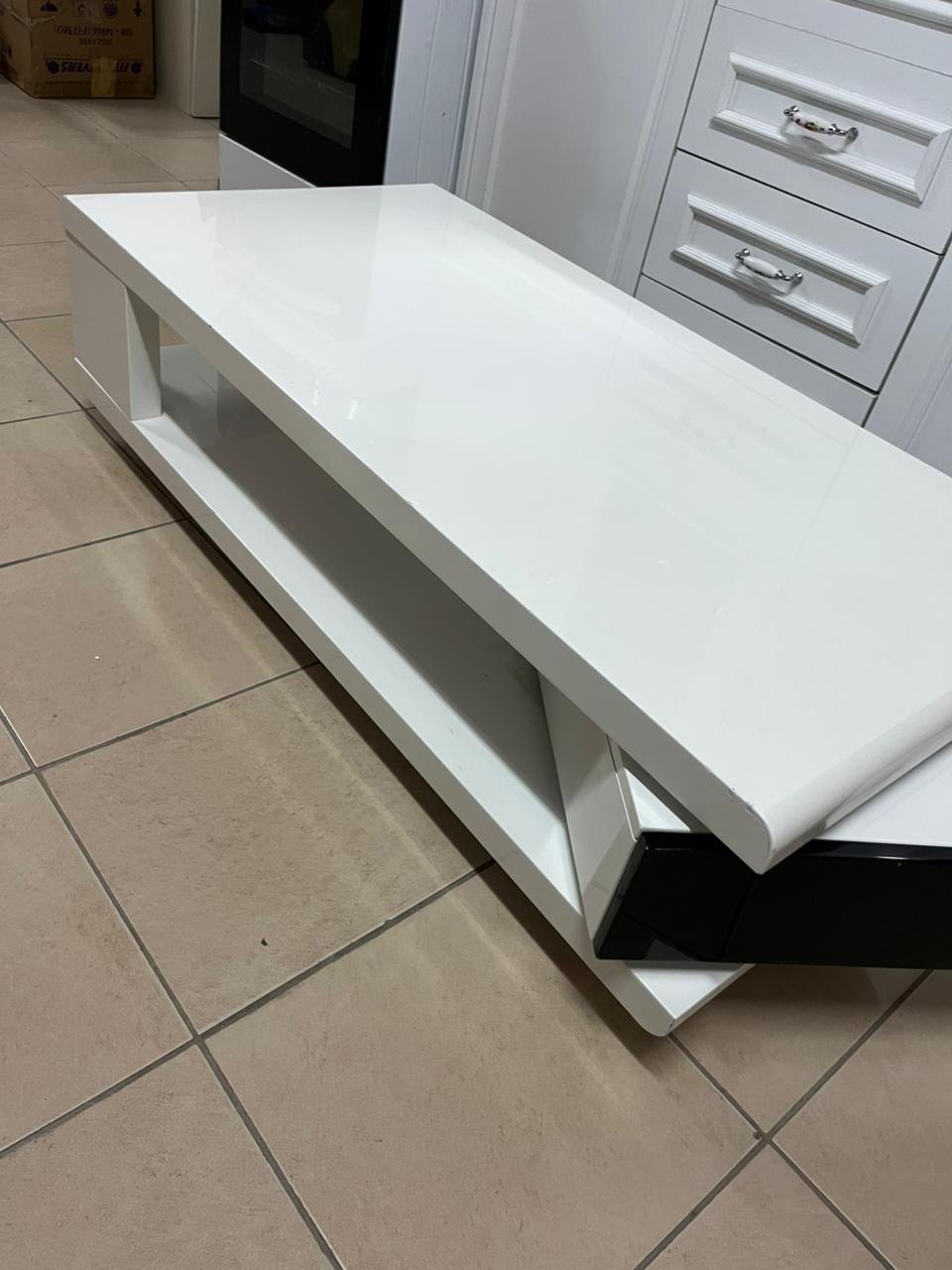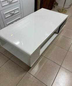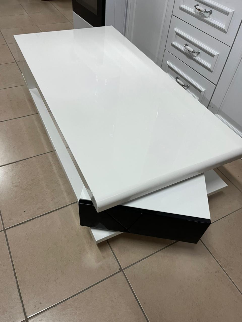 A modern coffee table in glossy white with a black lower drawer featuring a distinctive geometric design.