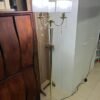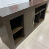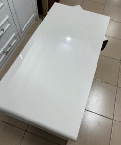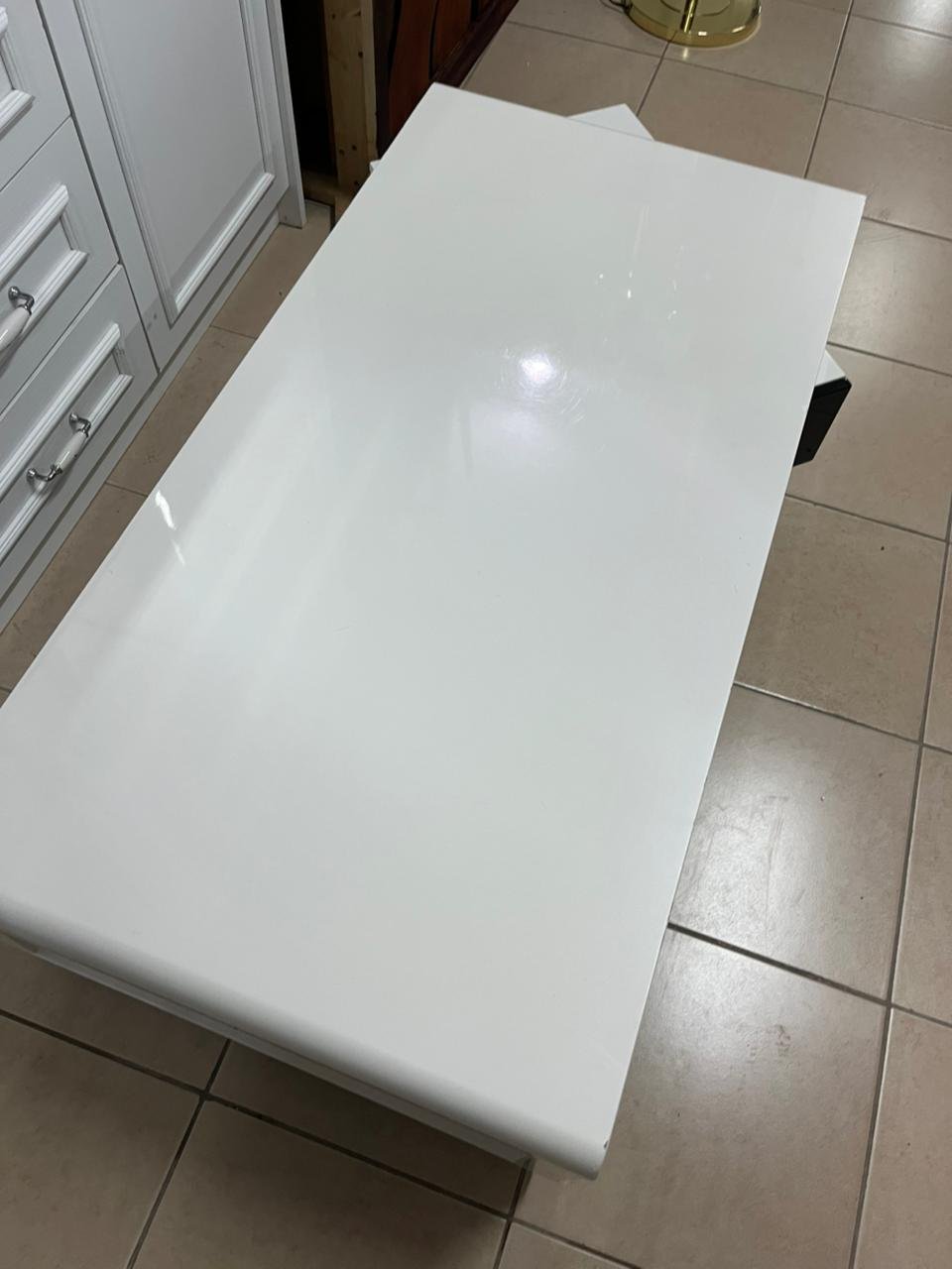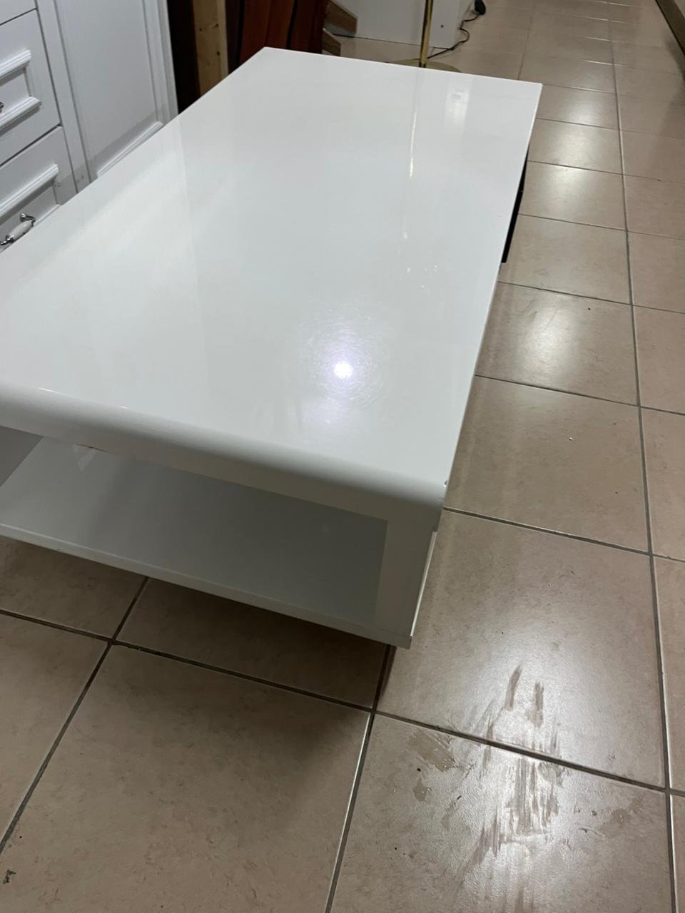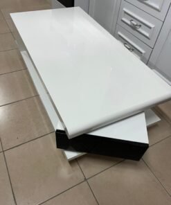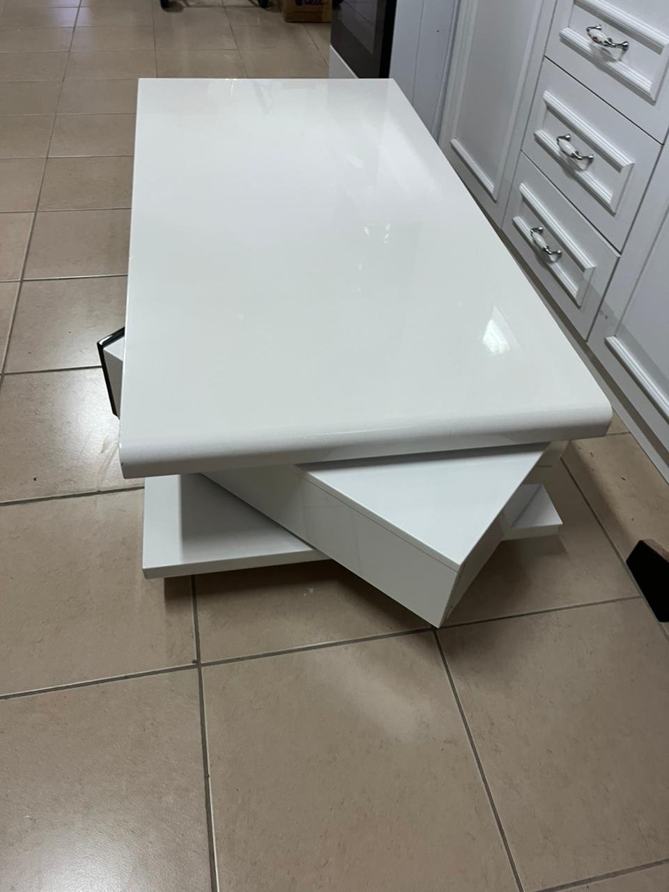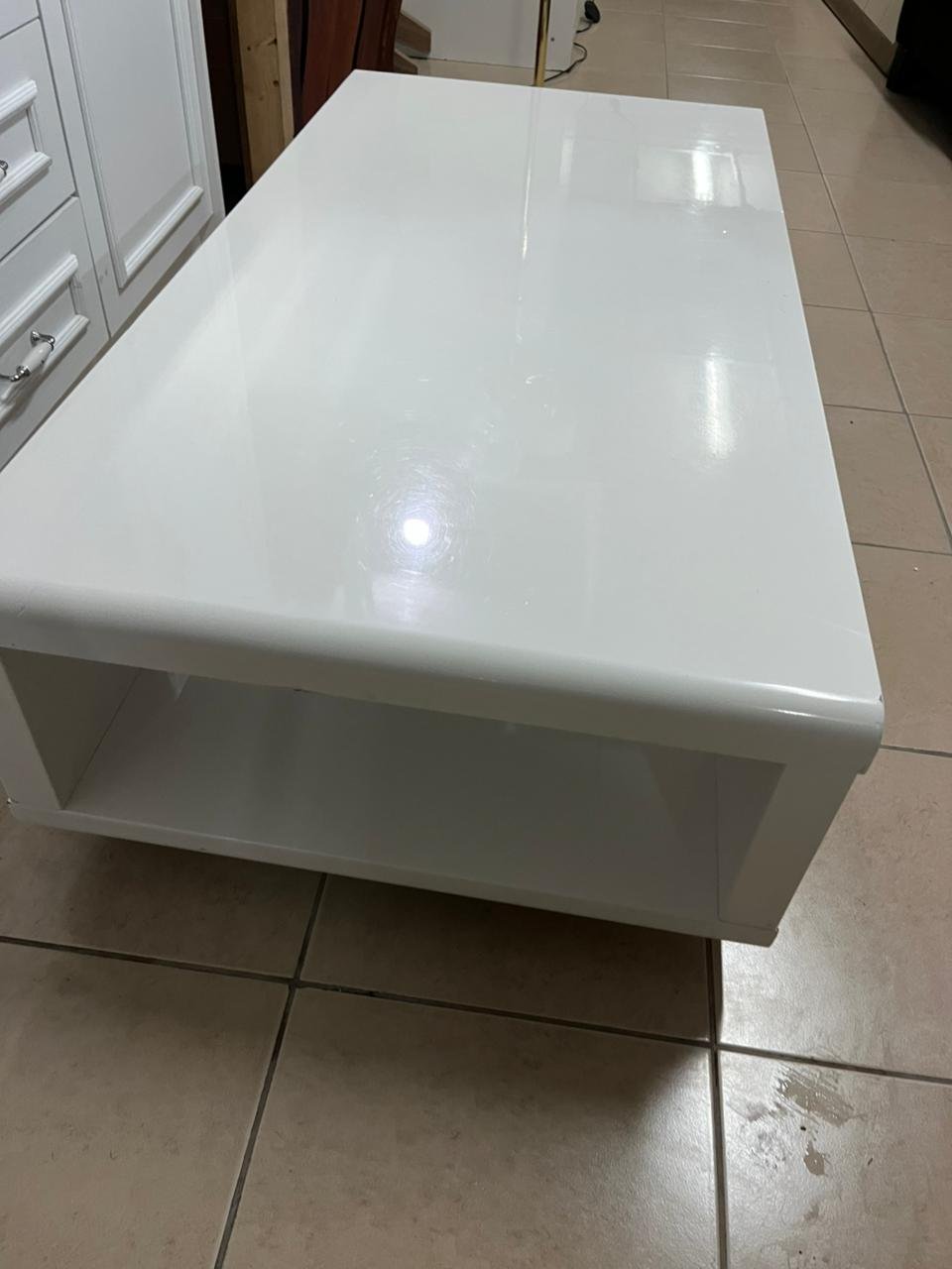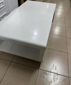 A modern coffee table in glossy white with a black lower drawer featuring a distinctive geometric design.