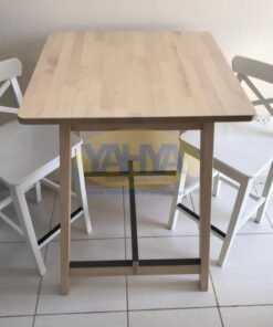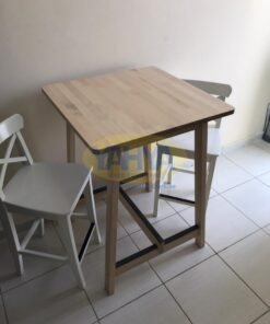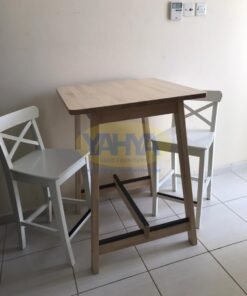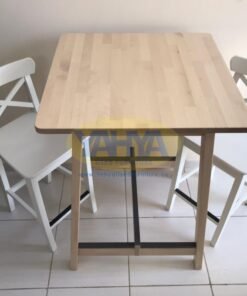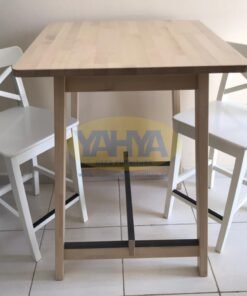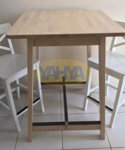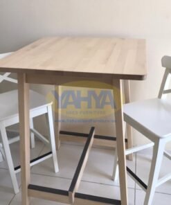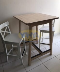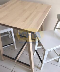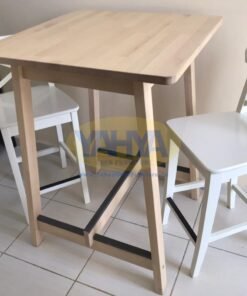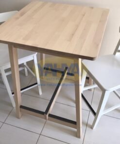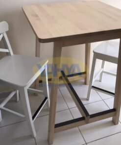 Bar table and two bar stools, made of birch wood and offered by IKEA, are prime examples of the refined items we carry. They boast a sturdy structure crafted from solid wood and hardwood veneer. These unique designs display diverse grain patterns and natural color variations, all emphasizing the wood’s inherent charm. The metal on the footrest safeguards it from wear and tear, and the table’s rounded corners are tailored to ensure children’s safety. Its plastic feet shield your precious floors from potential scratches and stains caused by moisture.