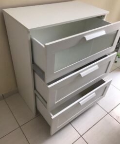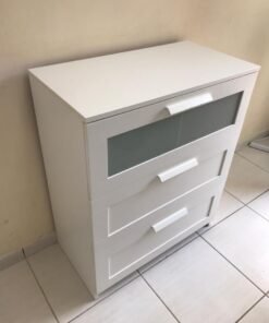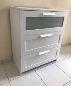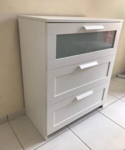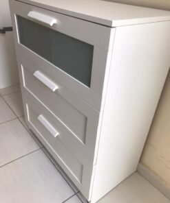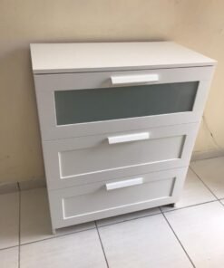 Transform your living space into a haven of sophistication with our exquisite drawer unit, exclusively from IKEA. Meticulously crafted, this stunning piece boasts a frosted glass top drawer that not only adds a touch of opulence but also creates a unique and refined aesthetic. Whether showcased as a standalone statement or arranged in pairs, the versatility of this chest of drawers enhances the overall ambiance of your room, providing both style and functionality.