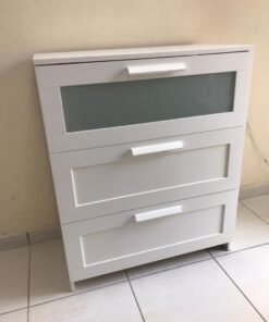Transform your living space into a haven of sophistication with our exquisite drawer unit, exclusively from IKEA. Meticulously crafted, this stunning piece boasts a frosted glass top drawer that not only adds a touch of opulence but also creates a unique and refined aesthetic. Whether showcased as a standalone statement or arranged in pairs, the versatility of this chest of drawers enhances the overall ambiance of your room, providing both style and functionality.