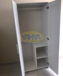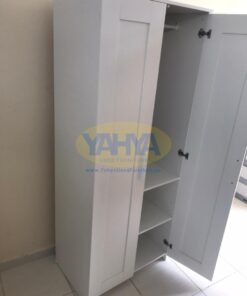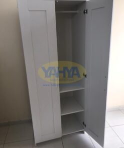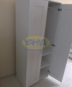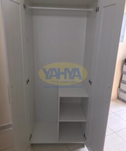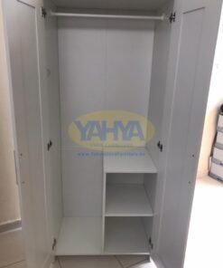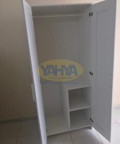 The first section of the wardrobe includes sturdy interior shelves, allowing you to fold clothes like shirts and jackets with precision. Additionally, there’s a clothes hanging rail to elegantly organize hanging items, whether they are dresses or shirts.