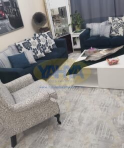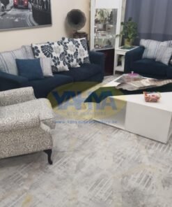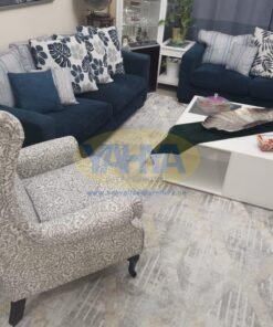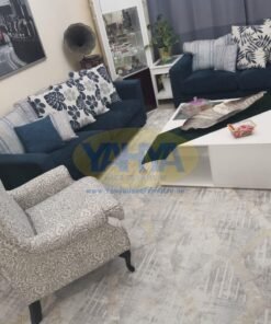Both the sofa, sourced from Home R US, and the armchair, from Home Box, boast of premium quality fabric covers. These covers, crafted from the finest polyester, emulate a soft felt feel with a mesmerizing dark blue blend effect.