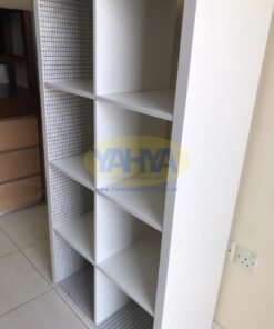 The shelving unit’s sleek surfaces and gently rounded corners elevate its aesthetics, presenting a sturdy and harmonious visual.