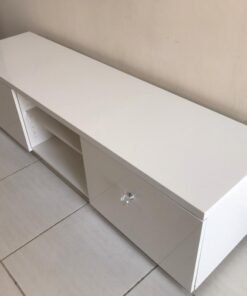 Presenting the BYÅS TV bench from IKEA, available in a sleek high-gloss white finish. This TV bench offers a versatile storage solution, blending open and closed storage options for a tidy and organized space.