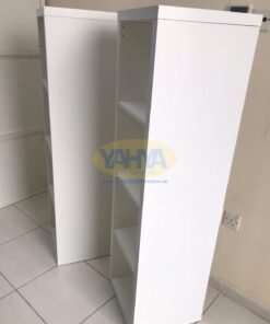 The shelving unit’s smooth surfaces and curved edges not only enhance its robust and functional appearance but also contribute to a unified and cohesive design.