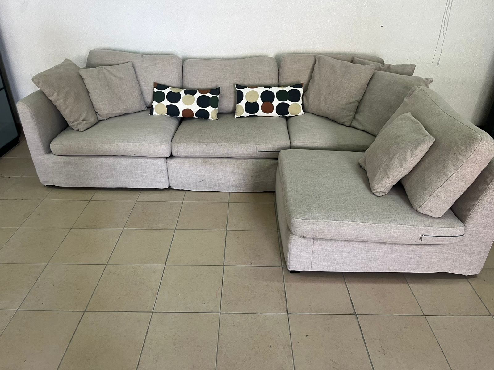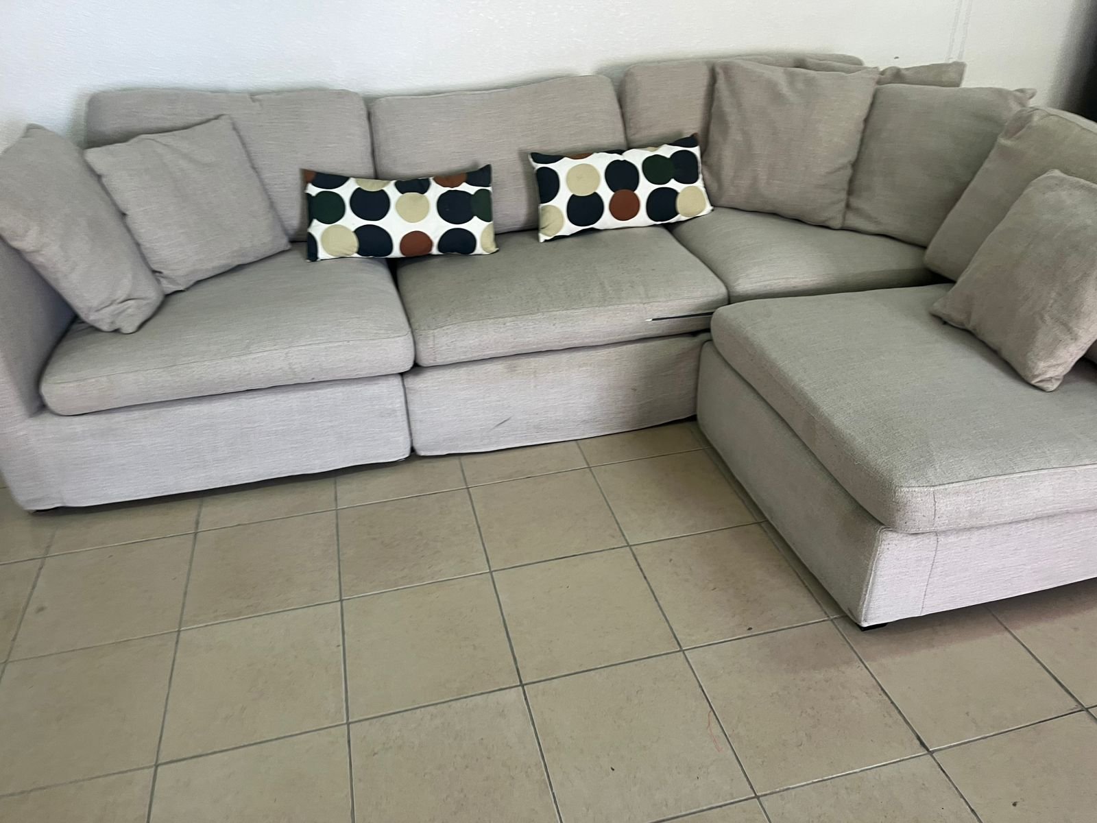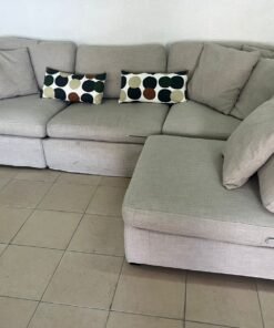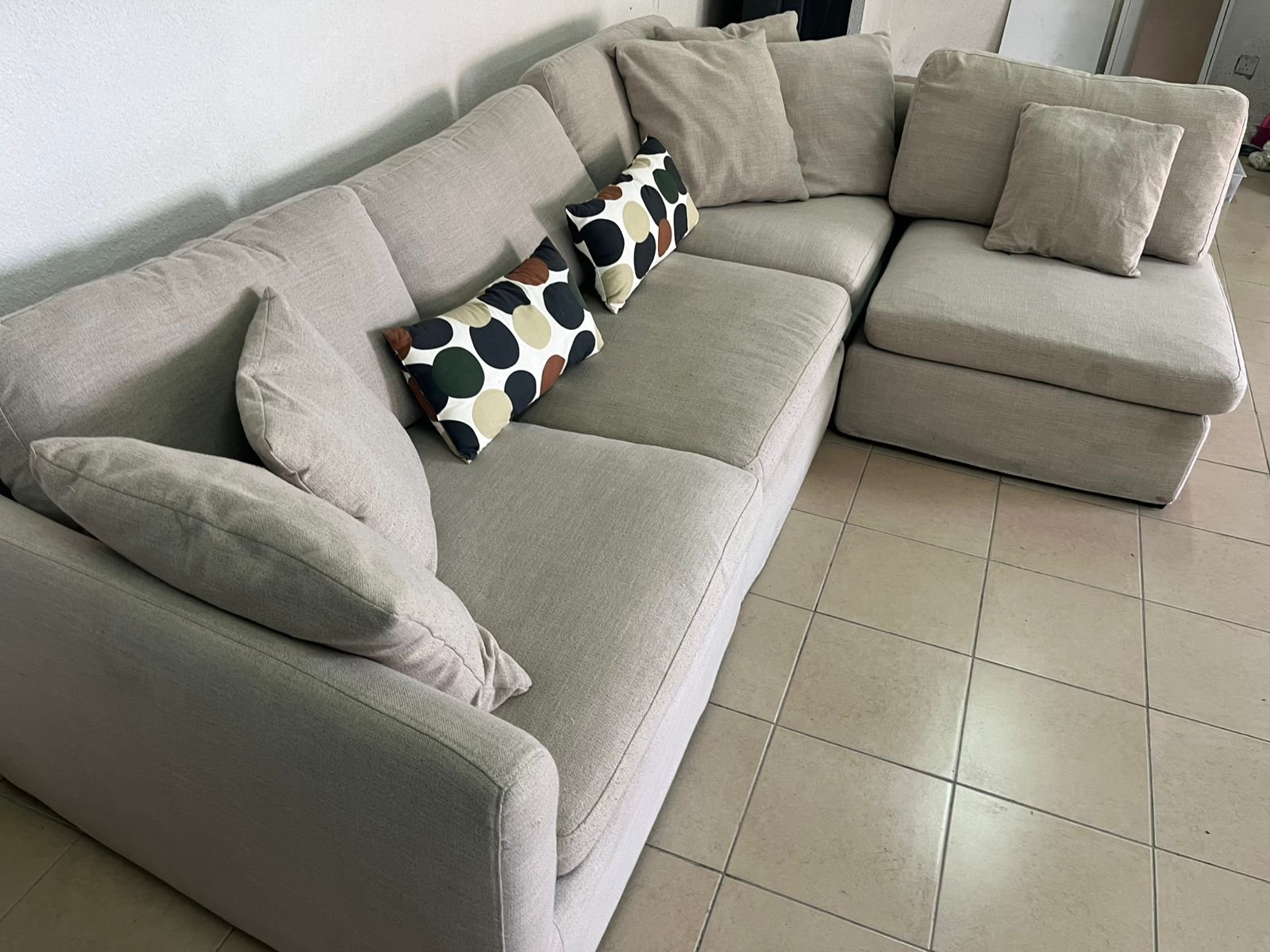 Light beige corner sofa, with a comfortable design and extra cushions.