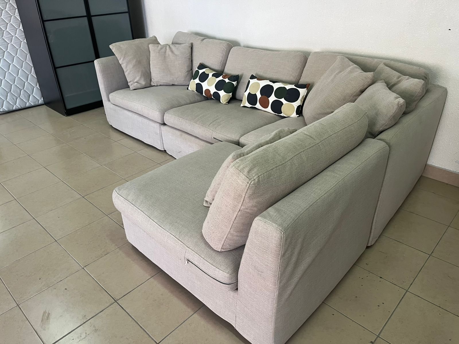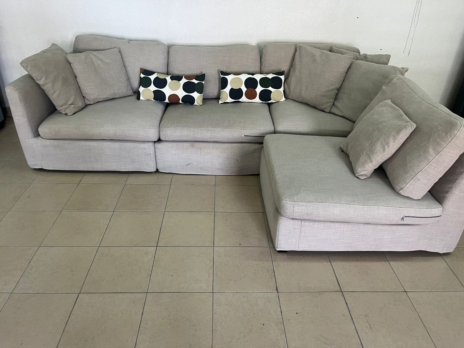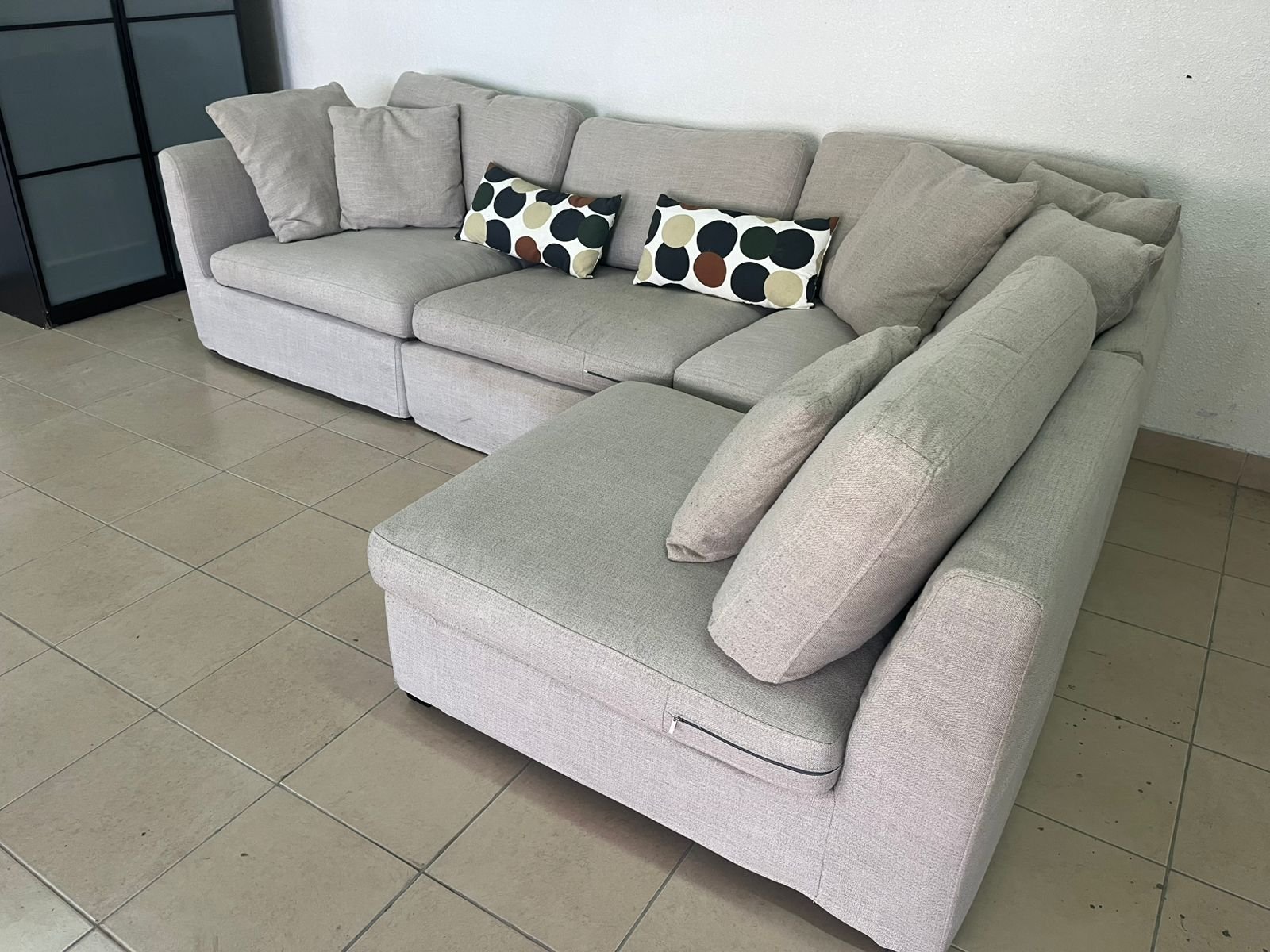 Light beige corner sofa, with a comfortable design and extra cushions.