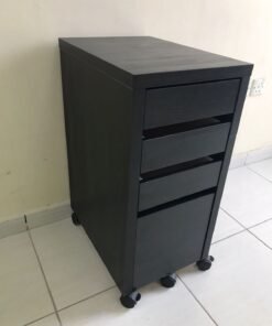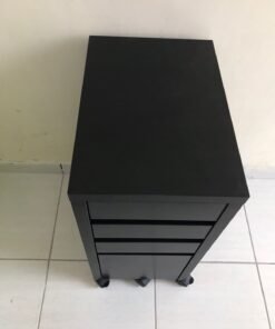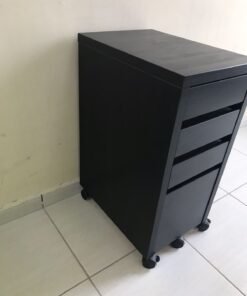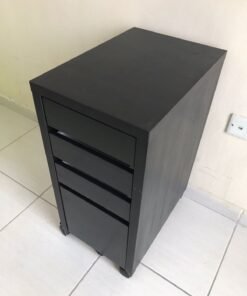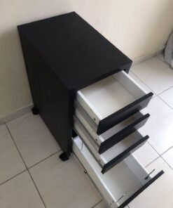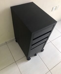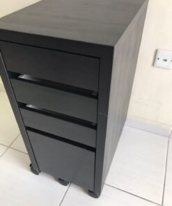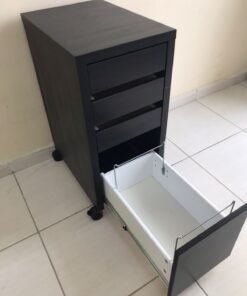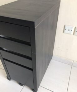 In a sophisticated black-brown finish, our drawer unit on castors provides both functionality and style. Equipped with drawer stops to prevent excessive pulling, this versatile piece can be positioned at the center of your space, thanks to its impeccably finished back. Sourced from the expansive realm of second-hand furniture, it epitomizes the quality we offer at Yahya Pre-Owned Furniture.