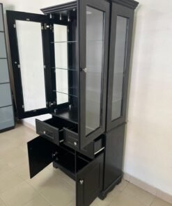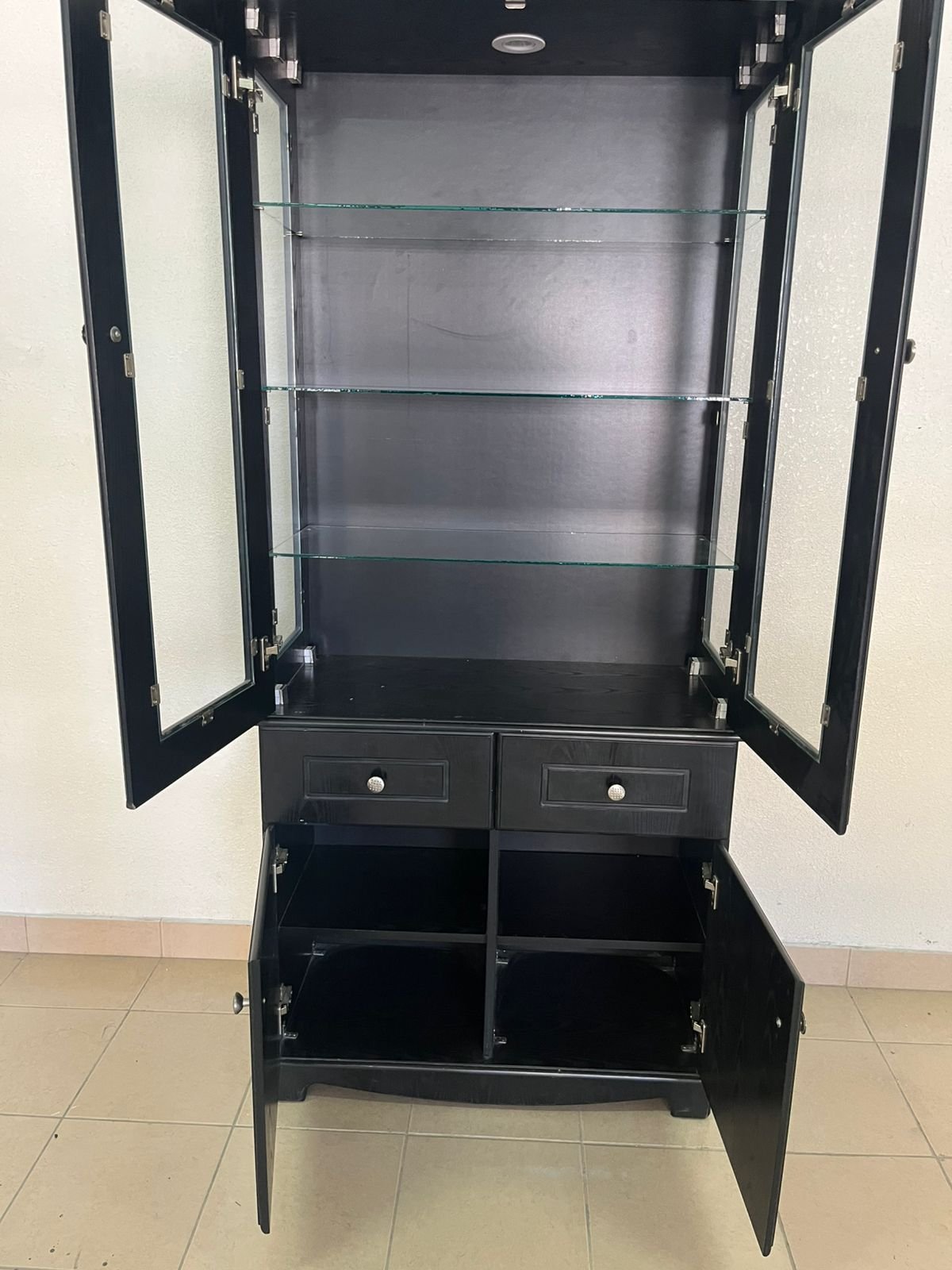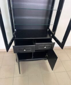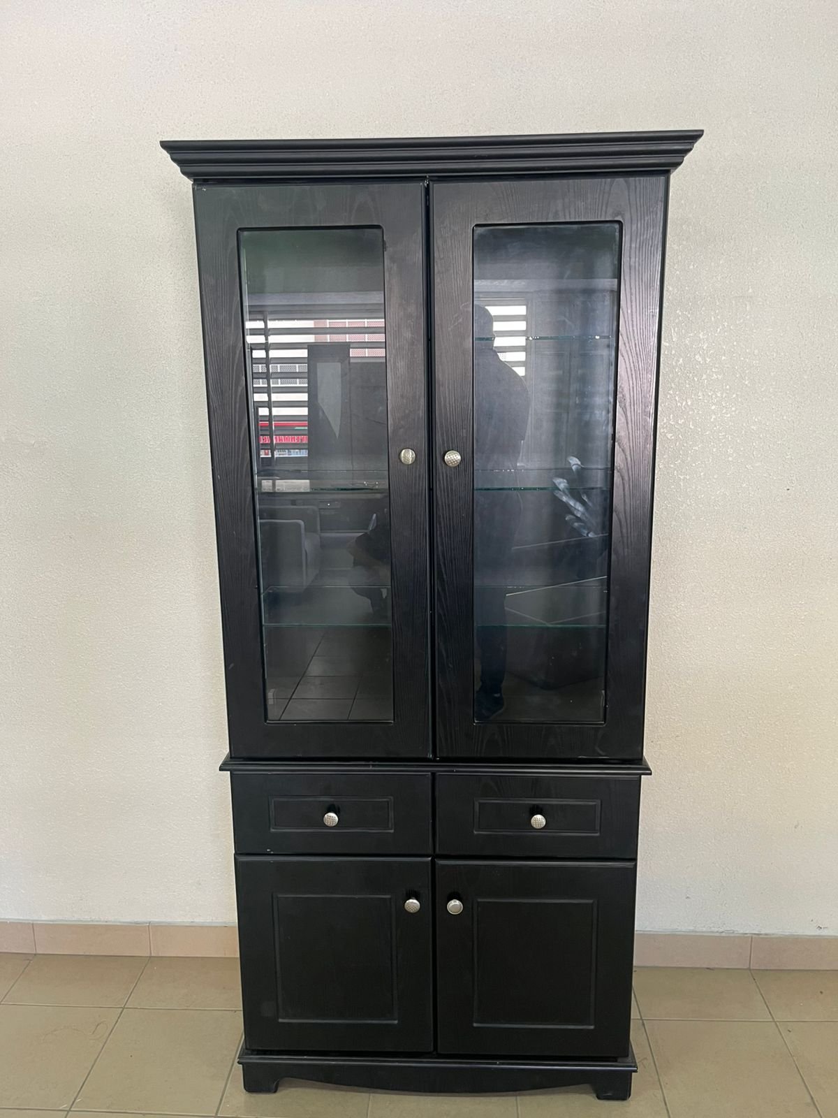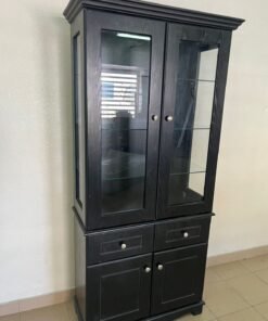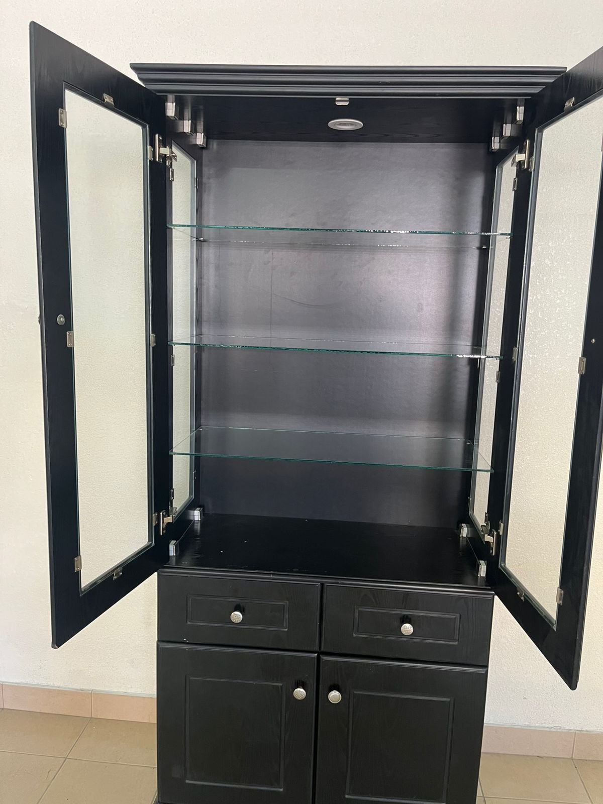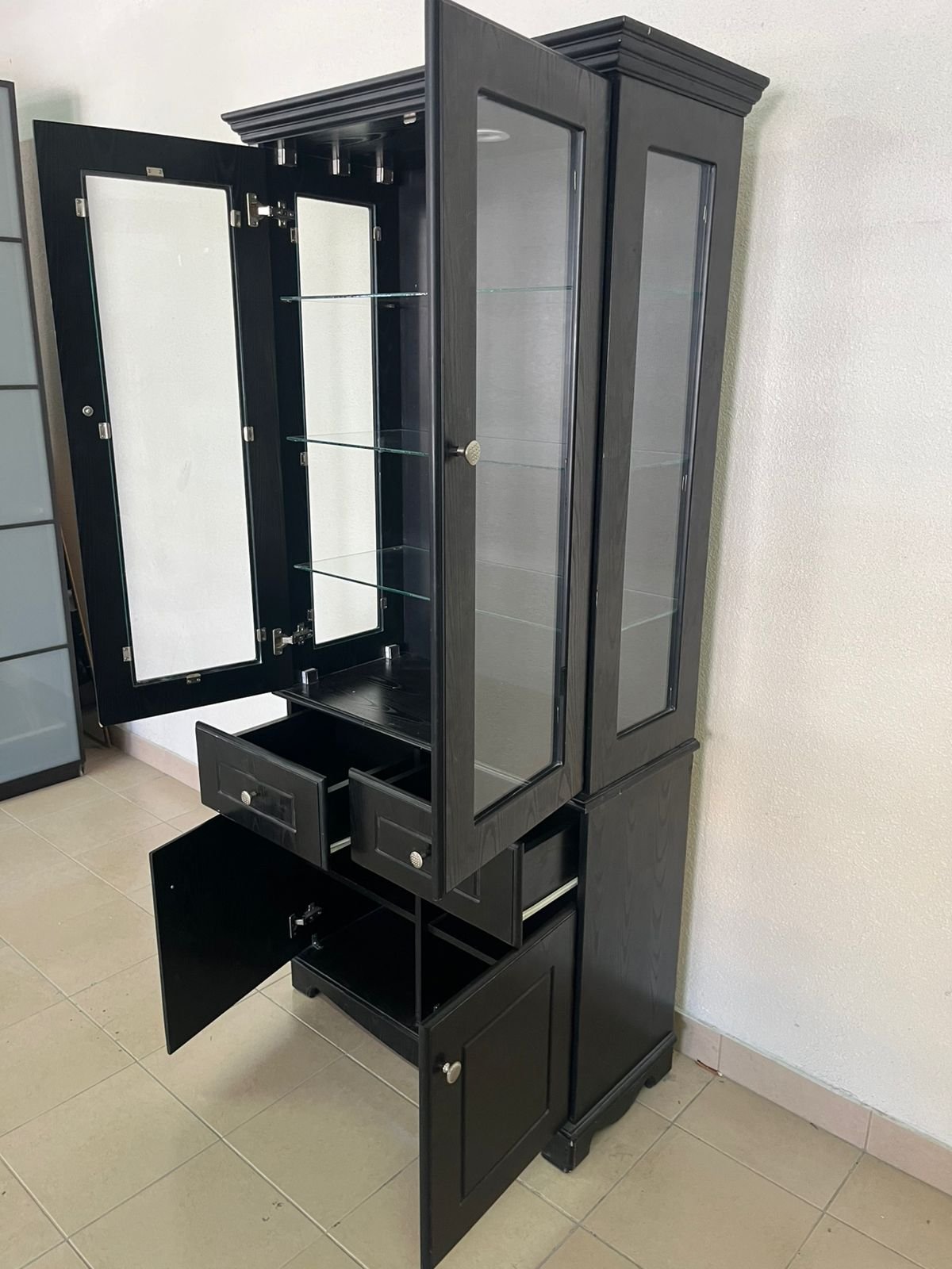 Storage cabinet with glass shelves, drawers, and wooden base cabinets.