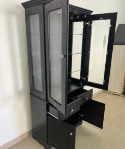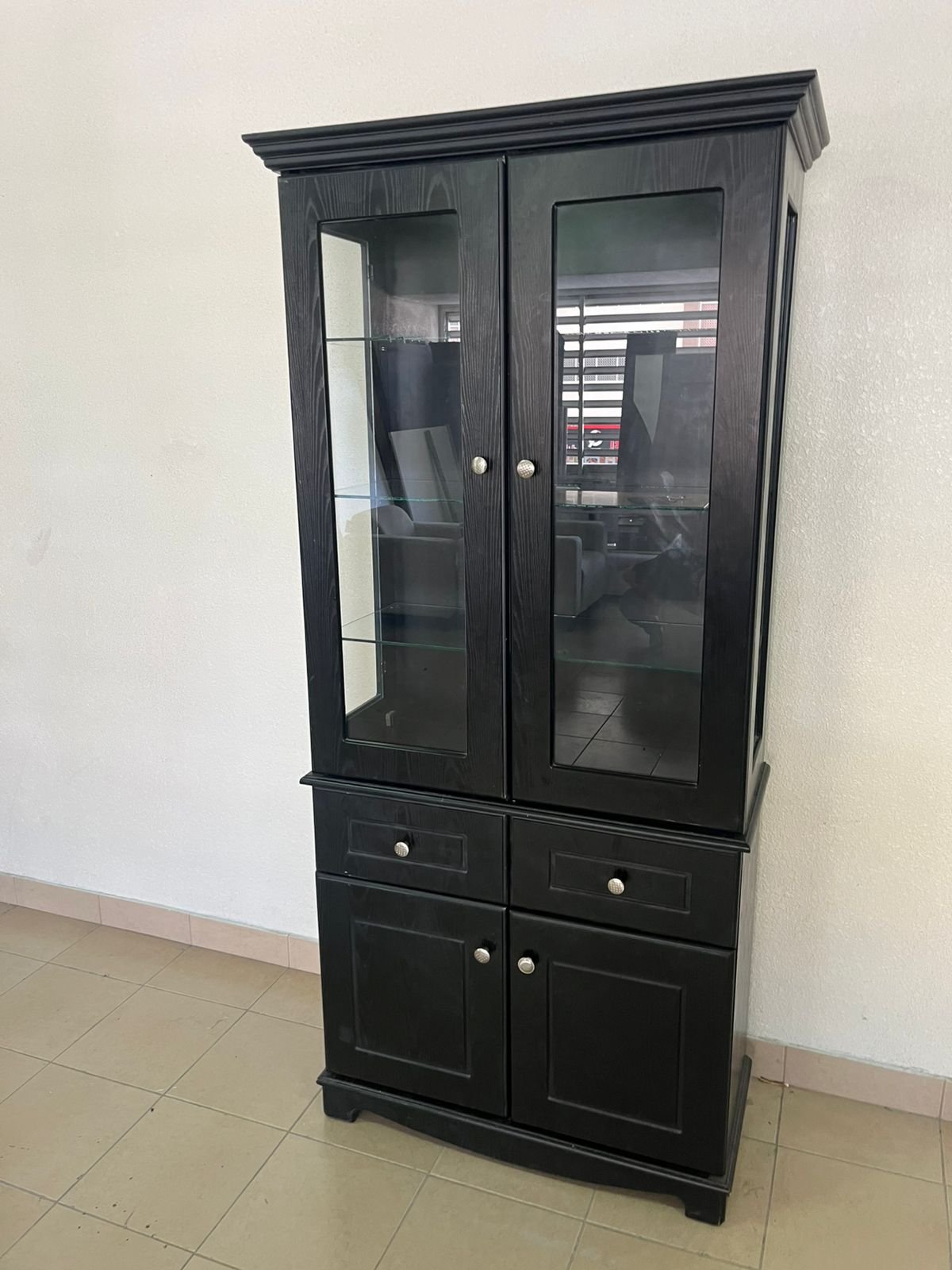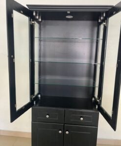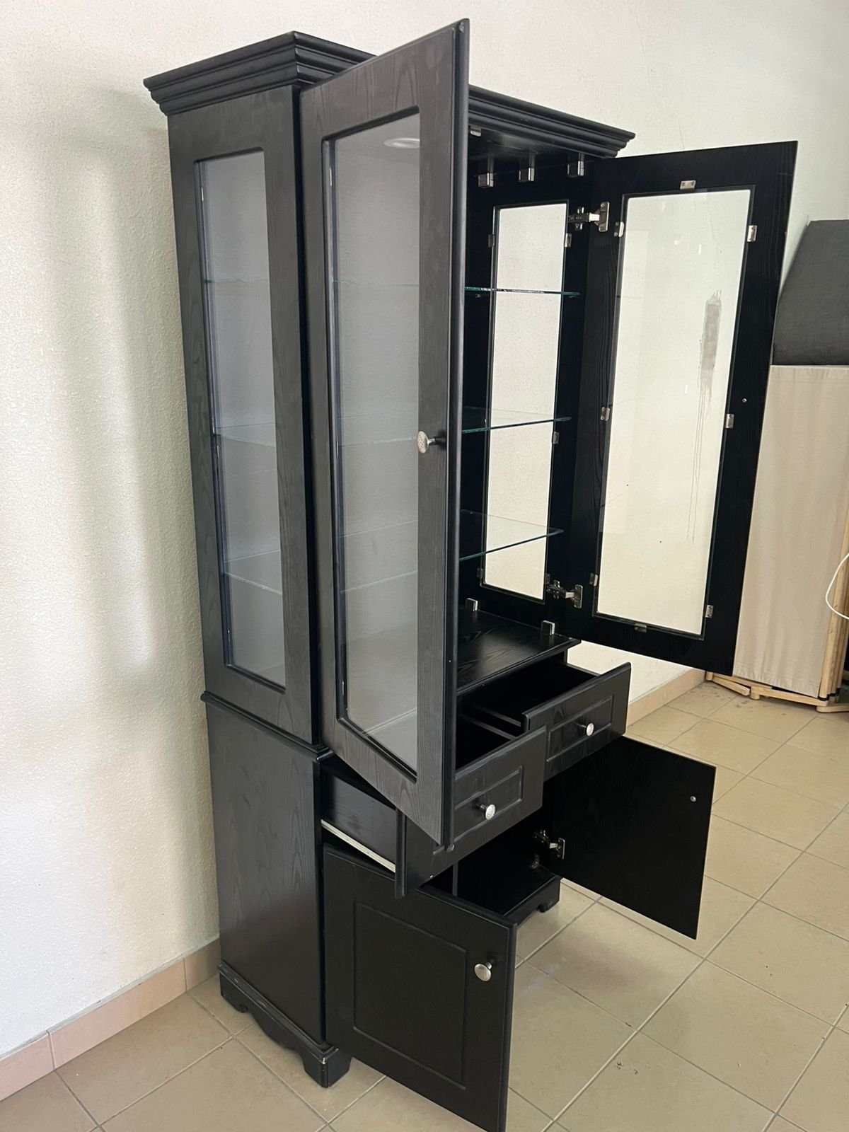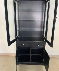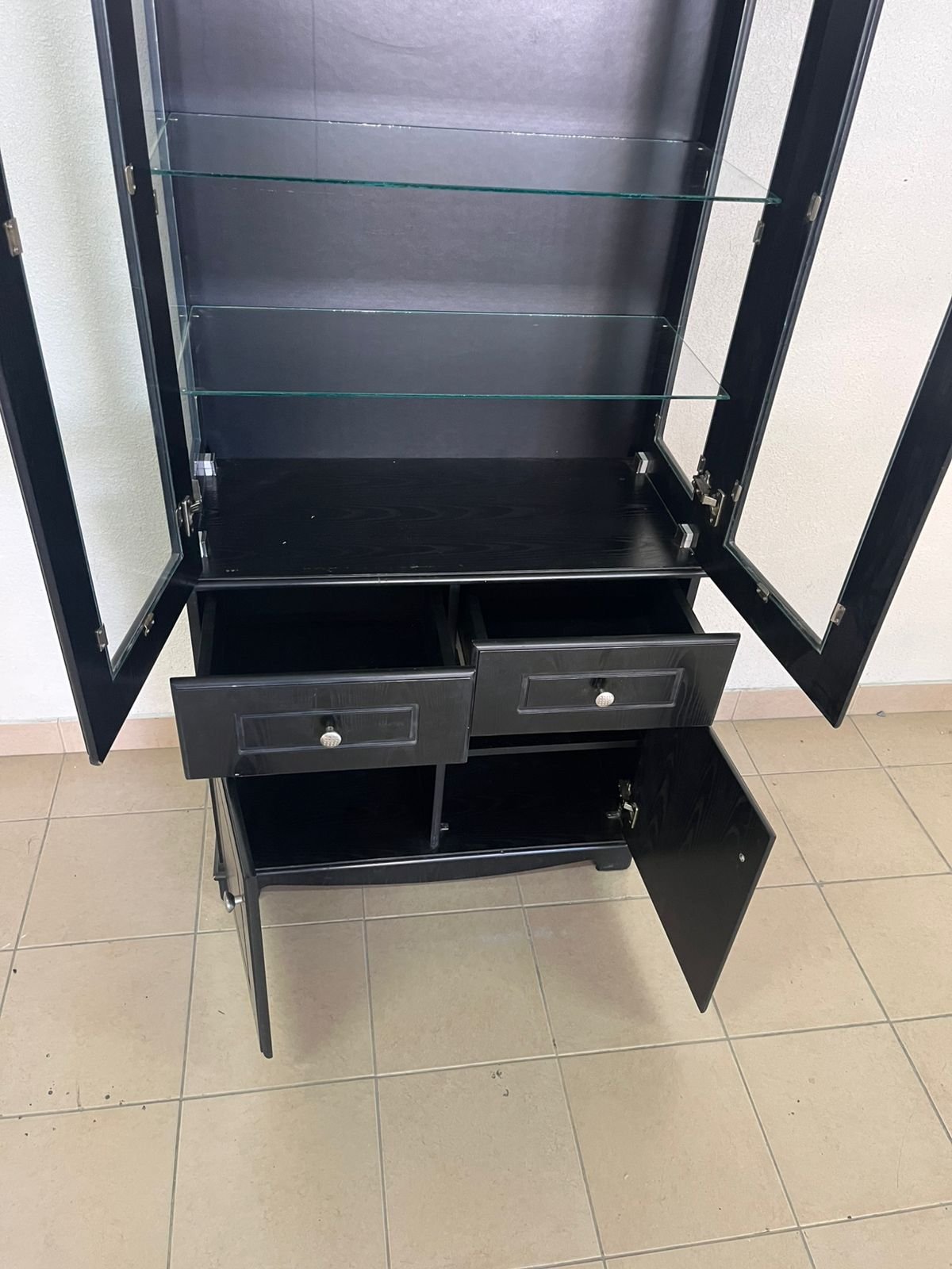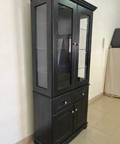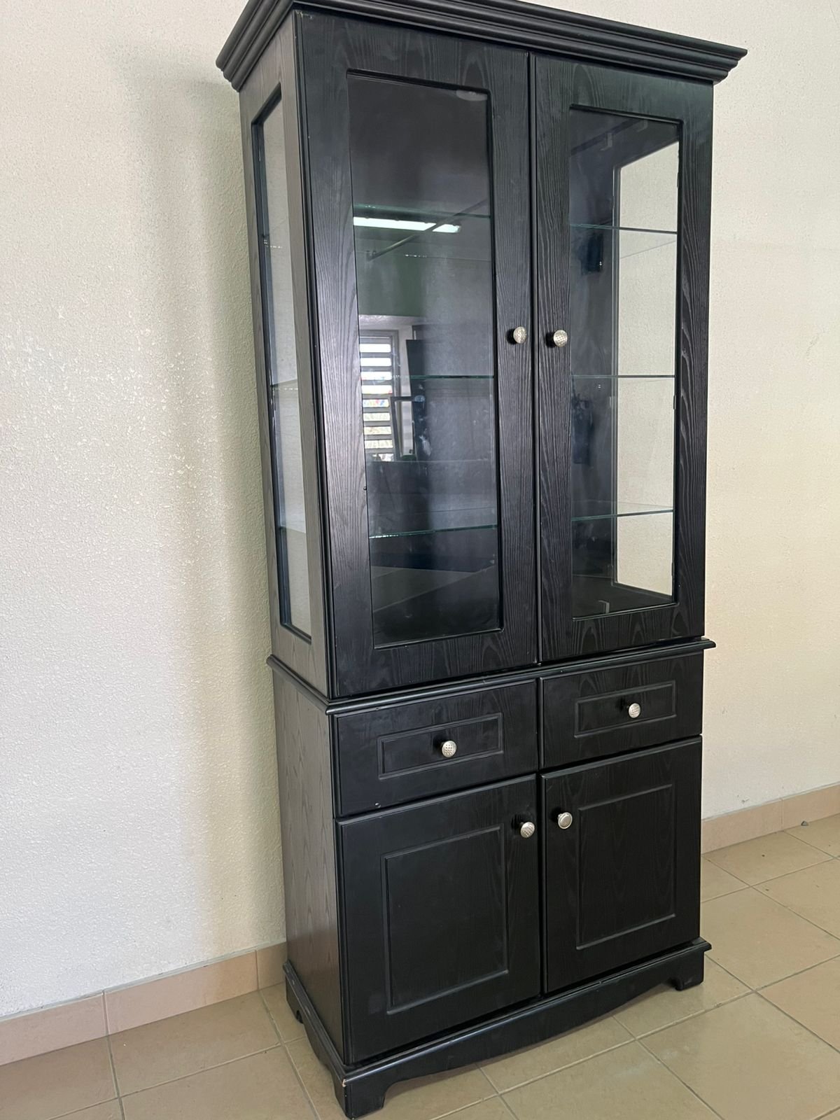 Storage cabinet with glass shelves, drawers, and wooden base cabinets.