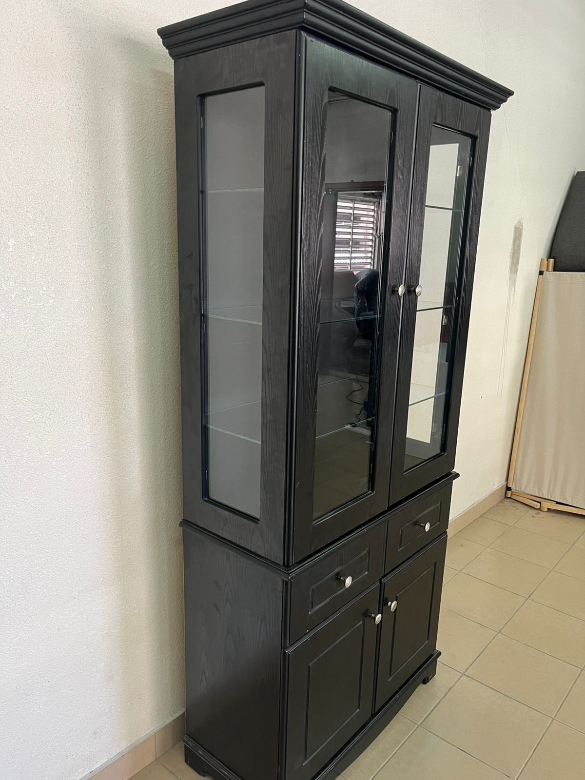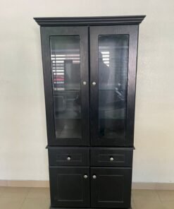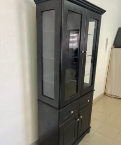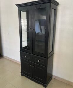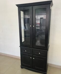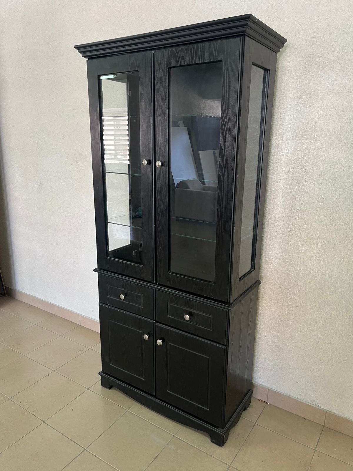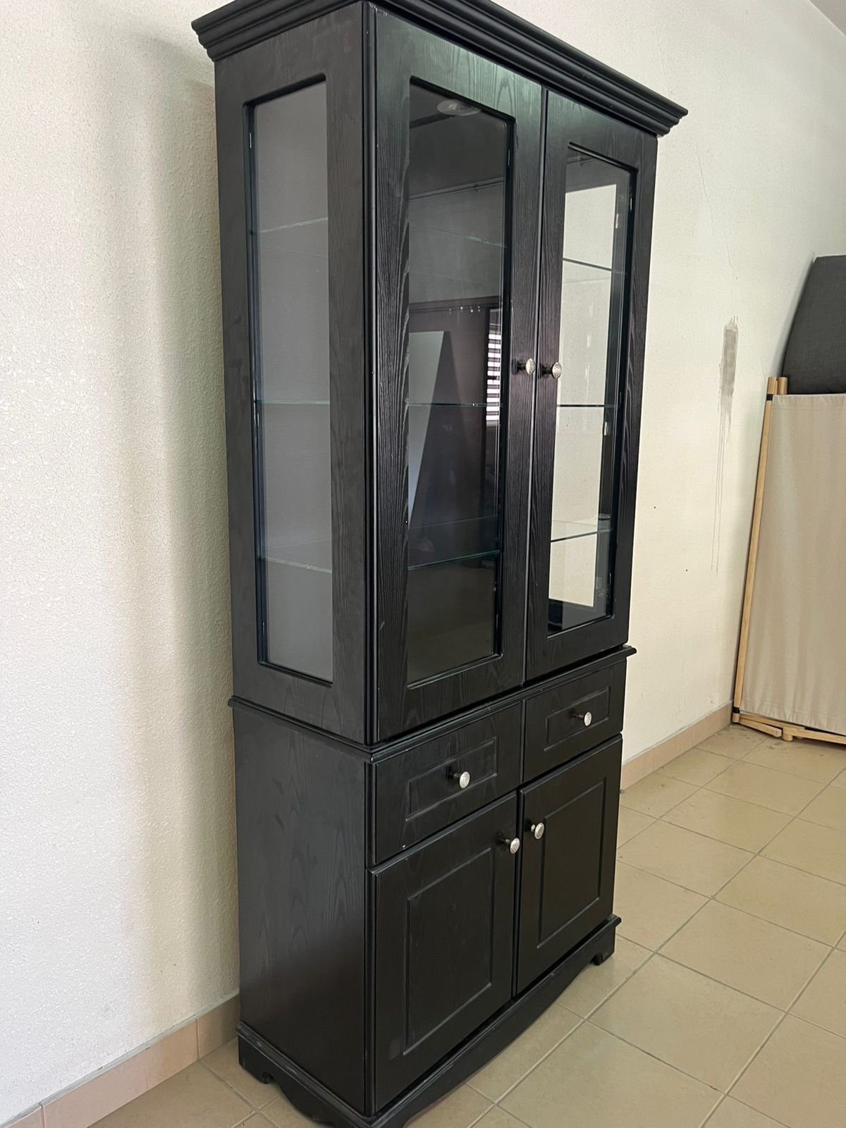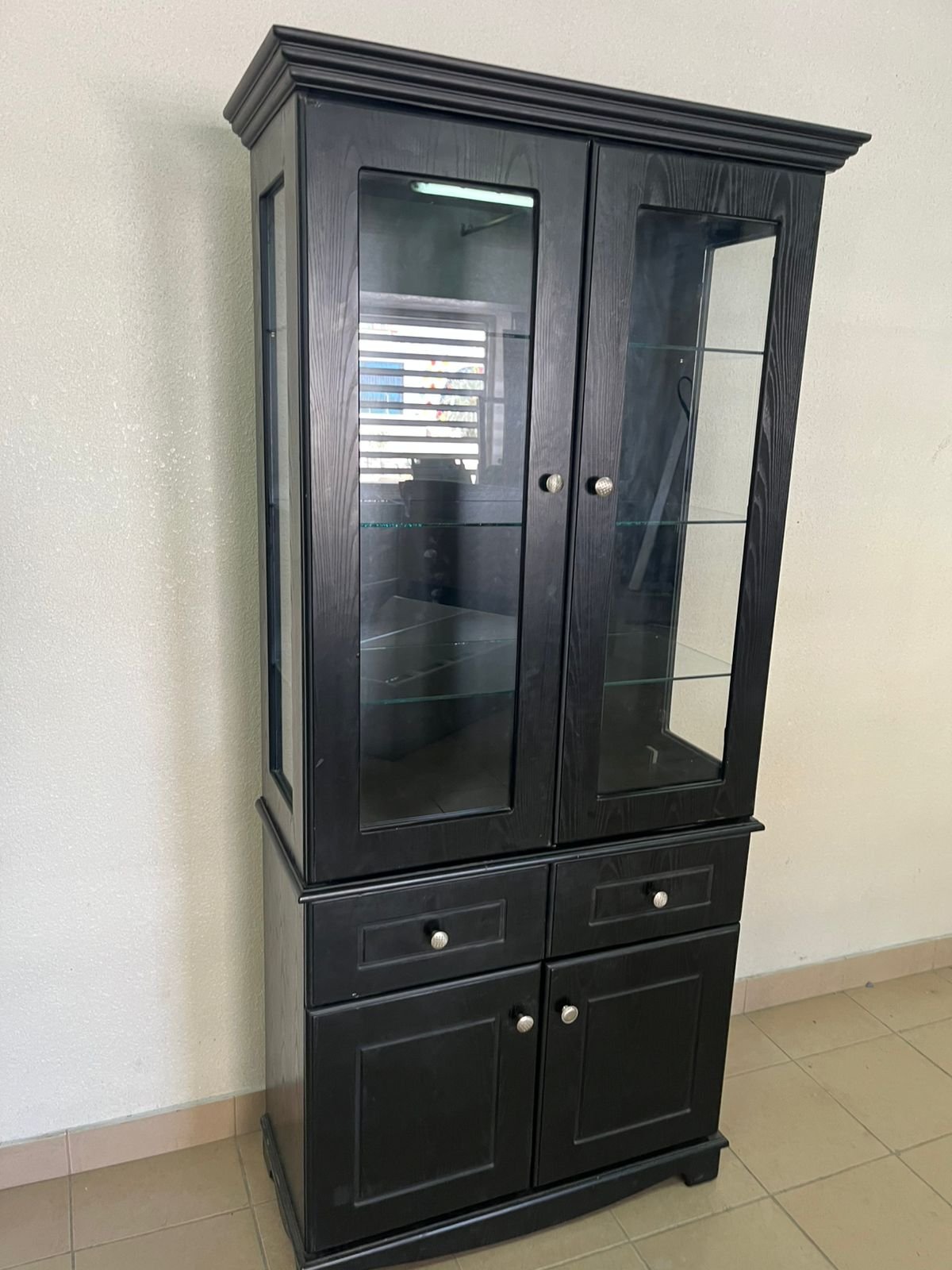 Storage cabinet with glass shelves, drawers, and wooden base cabinets.