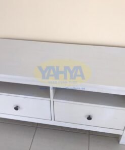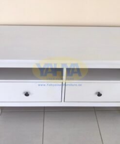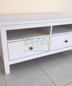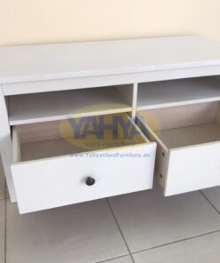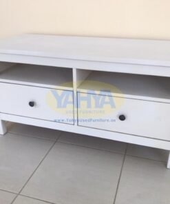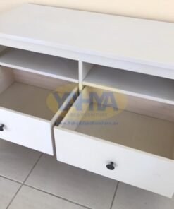 A white-stained TV bench with both shelves and drawers, as well as open and closed storage. A neat piece of furniture that fits almost anywhere and has space for pretty much all of your TV-equipment.