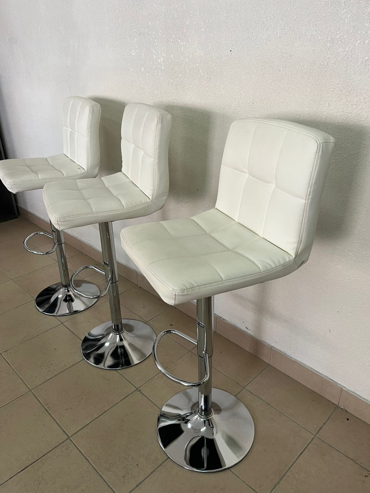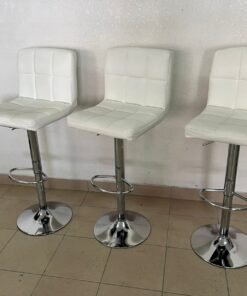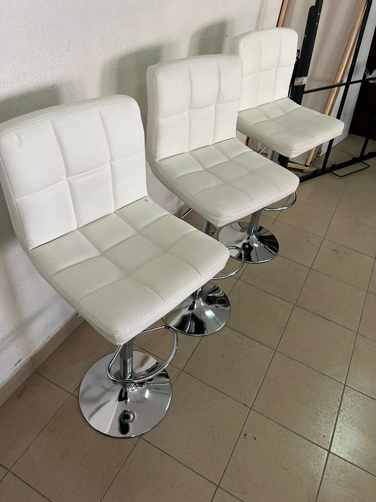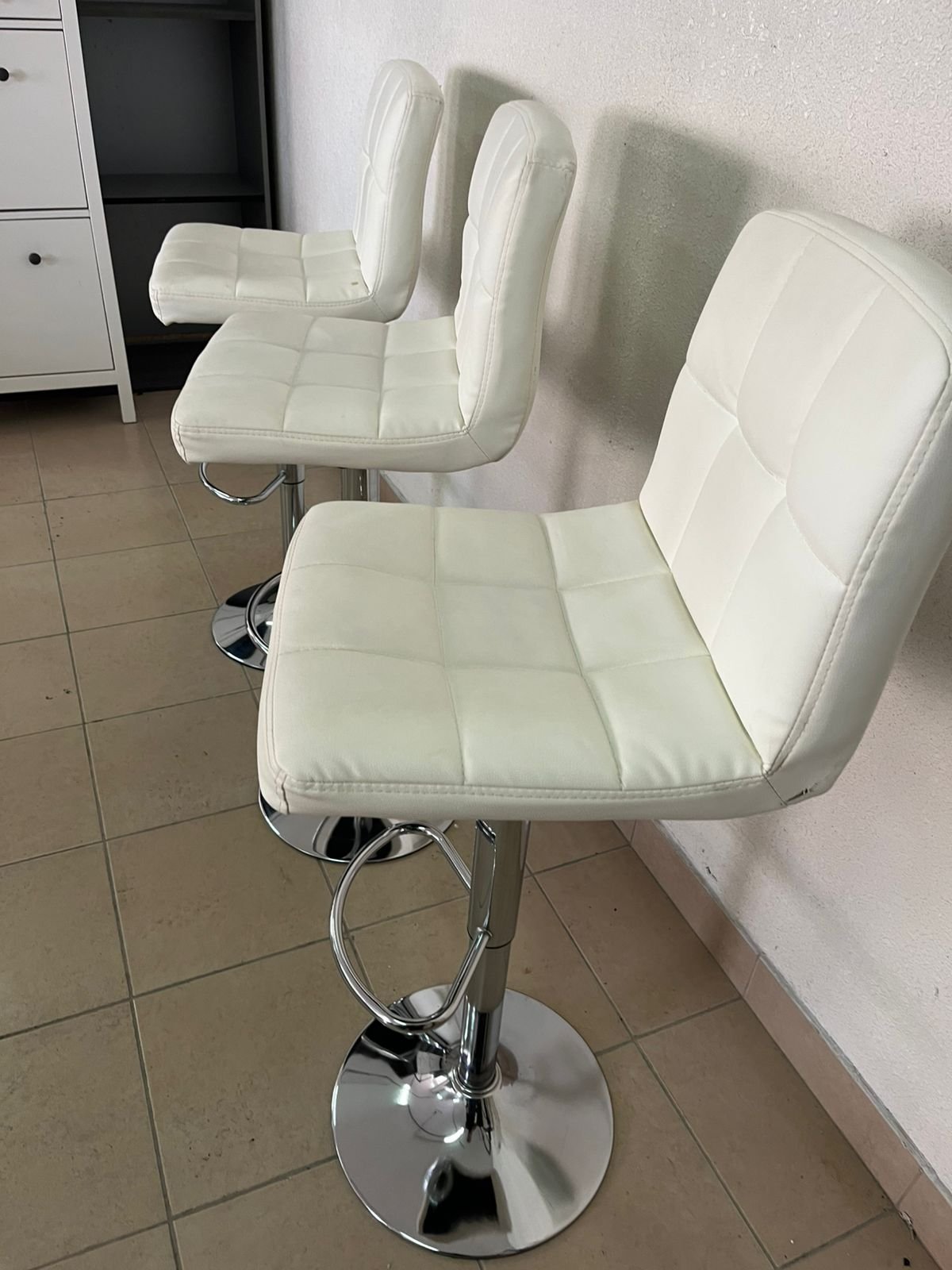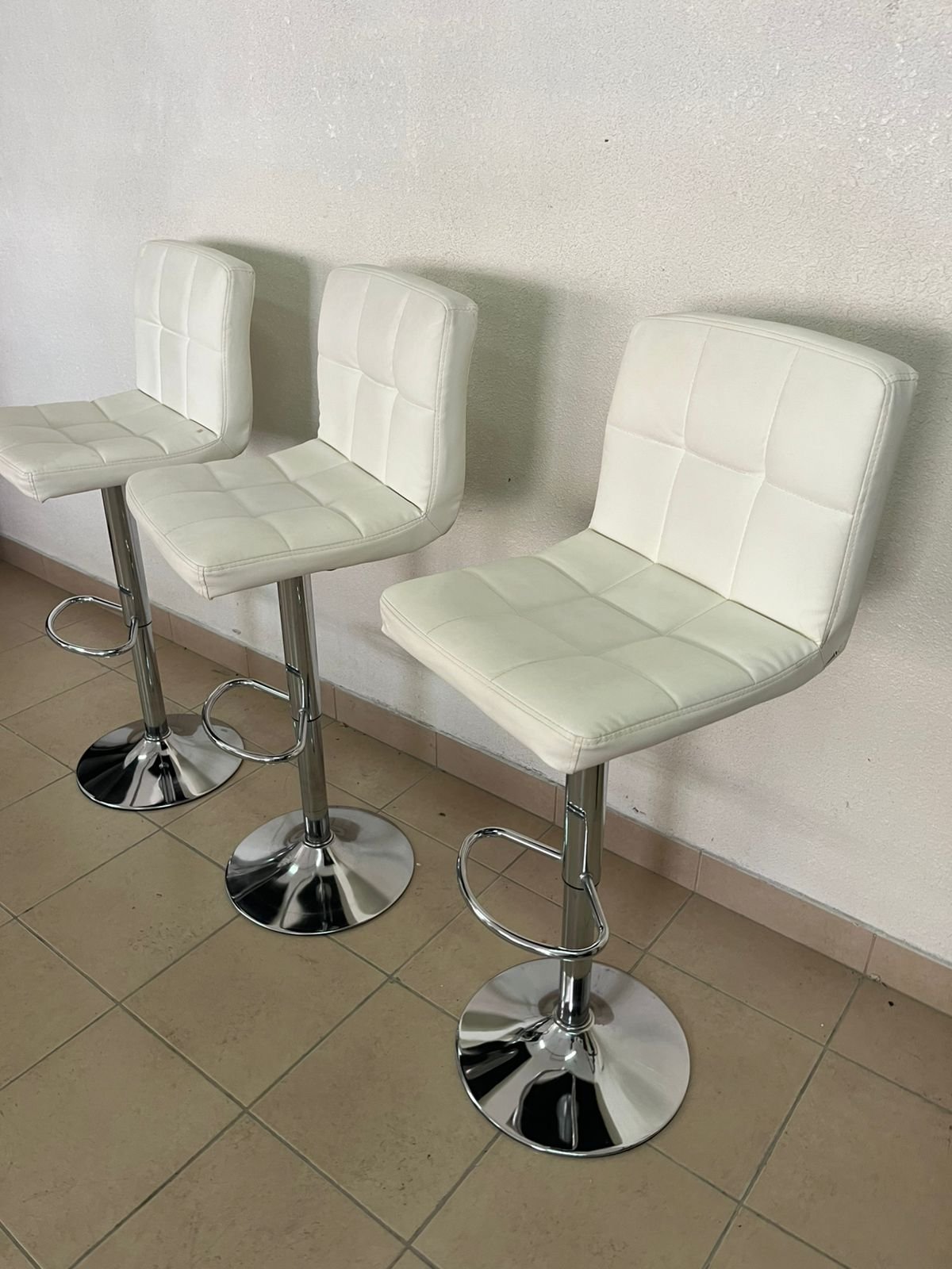 White bar stools with upholstered backrests